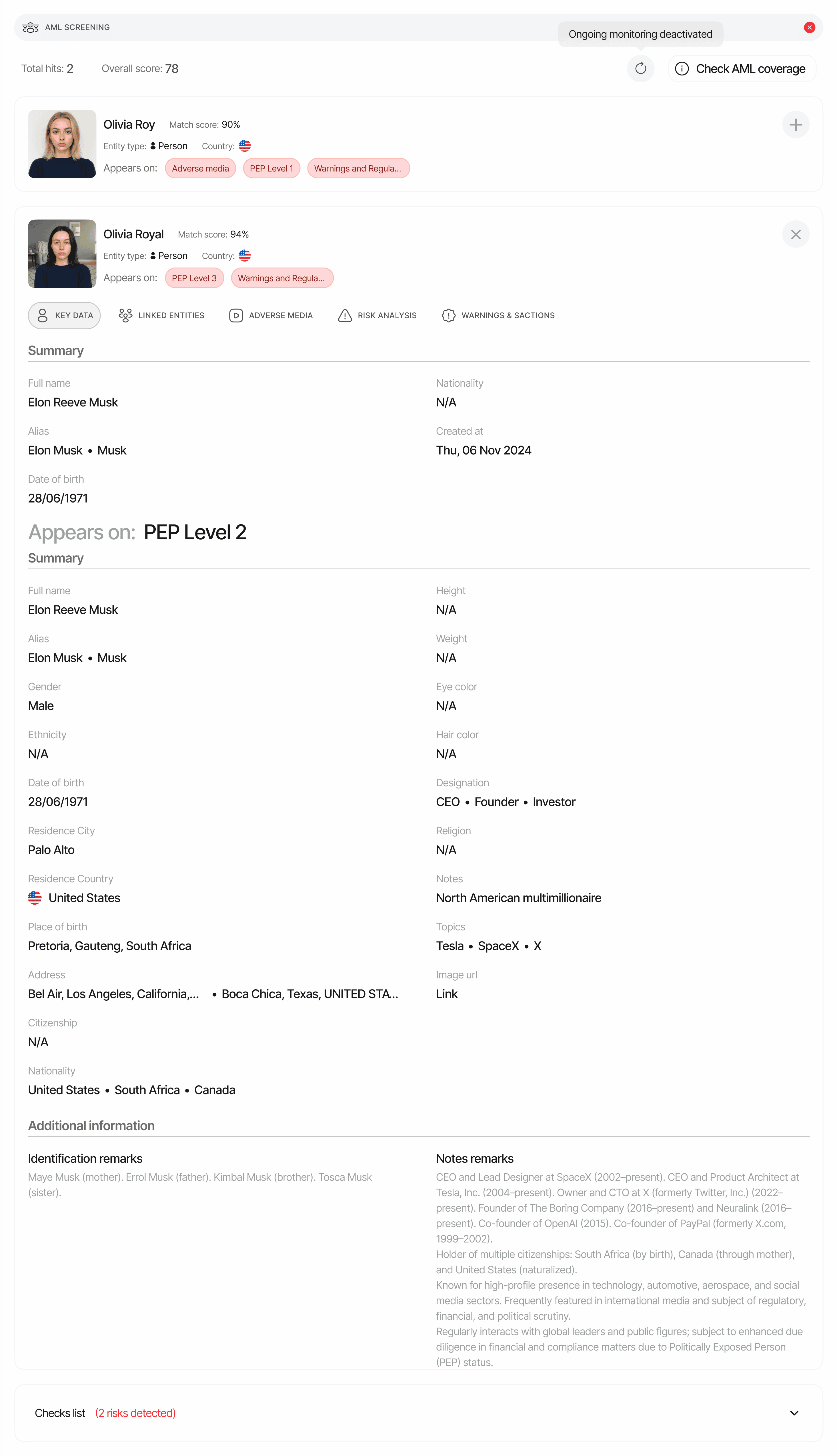 - AML Status: Overall screening status and risk level