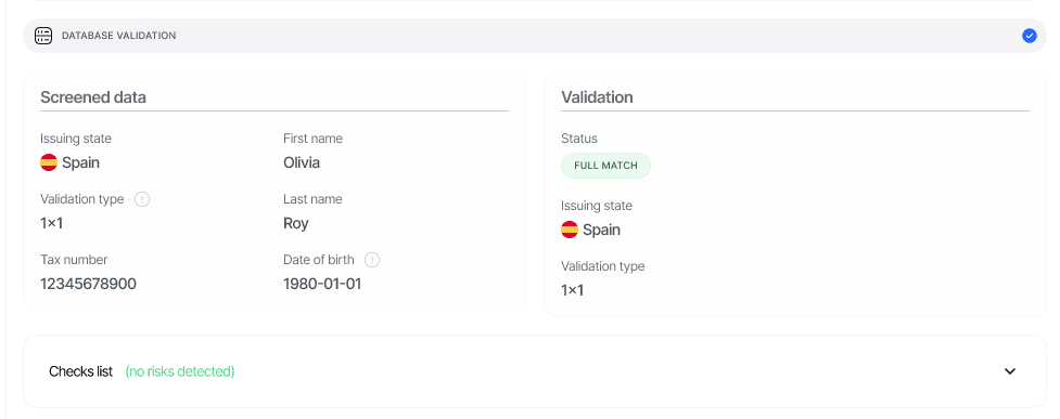 status: The overall outcome of the validation check (Approved,Declined, orIn Review).match_type: The overall match result, indicating the level of confidence in the user’s identity (full_match,partial_match, orno_match).issuing_state: The country where the validation was performed, represented by its three-letter ISO code.validation_type: The specific method used for validation, such as1x1or2x2matching.screened_data: The user-provided data that was used for the validation check.validations: An object containing the detailed results from each checked data point.