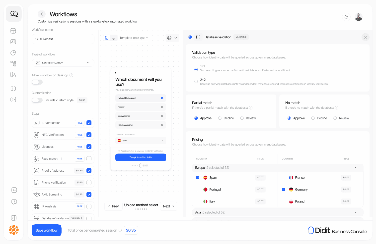 Database Validation is seamlessly integrated into the ID verification flow. It is triggered automatically and incurs a charge only under specific conditions:- The ID verification feature must be part of the active KYC workflow.