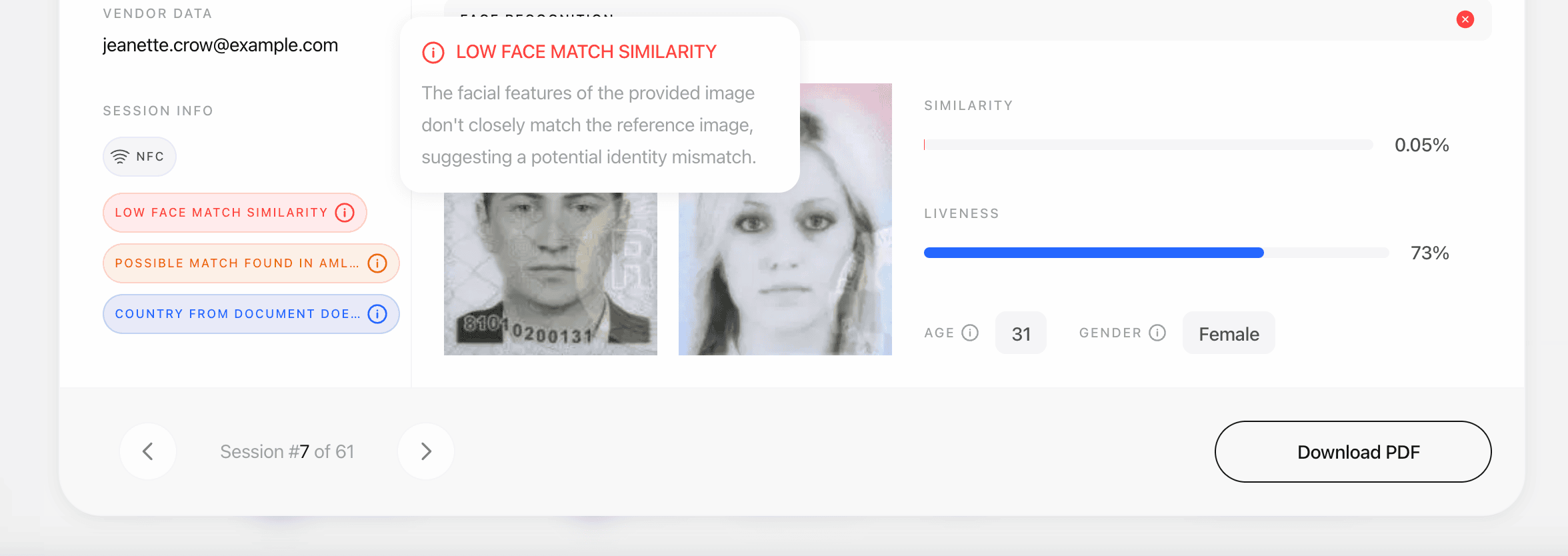LOW_FACE_MATCH_SIMILARITY | The facial features of the provided image don’t closely match the reference image, suggesting a potential identity mismatch. |