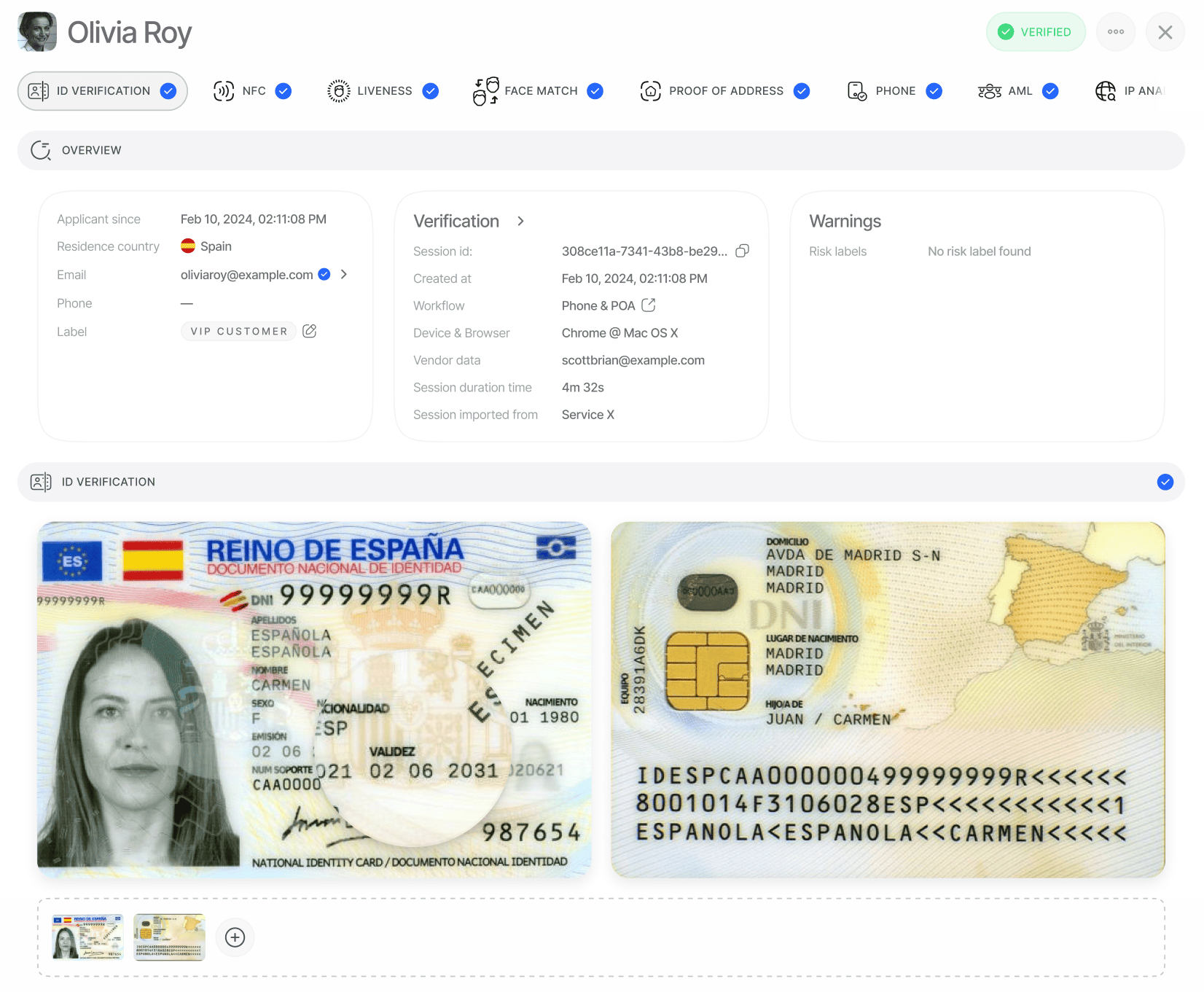 - ID Verification Status: Overall session status and specific verification results