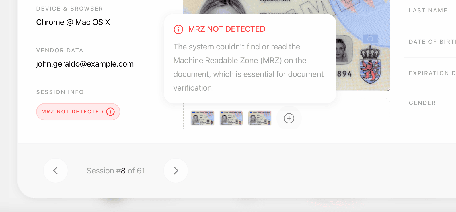 MRZ_VALIDATION_FAILED | The Machine Readable Zone (MRZ) on the document doesn’t meet the expected format or contains invalid data, indicating a potentially fraudulent or improperly issued document. This can also be caused by a low quality image that prevents proper reading of the MRZ. |