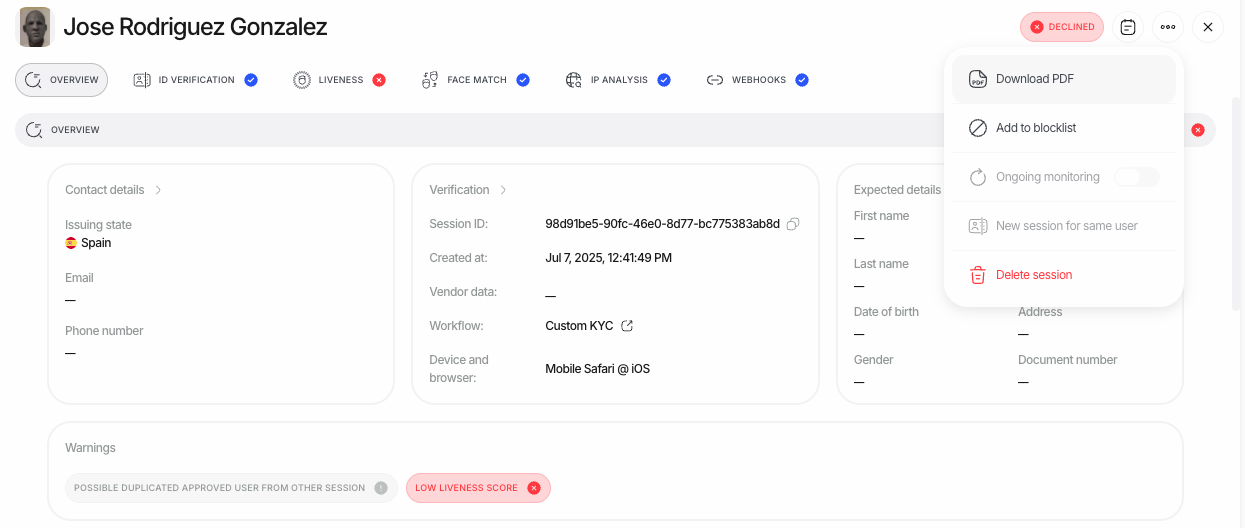 To export a PDF report containing the verification session results of a session, you can call the Generate PDF endpoint, or download it using Didit Console.