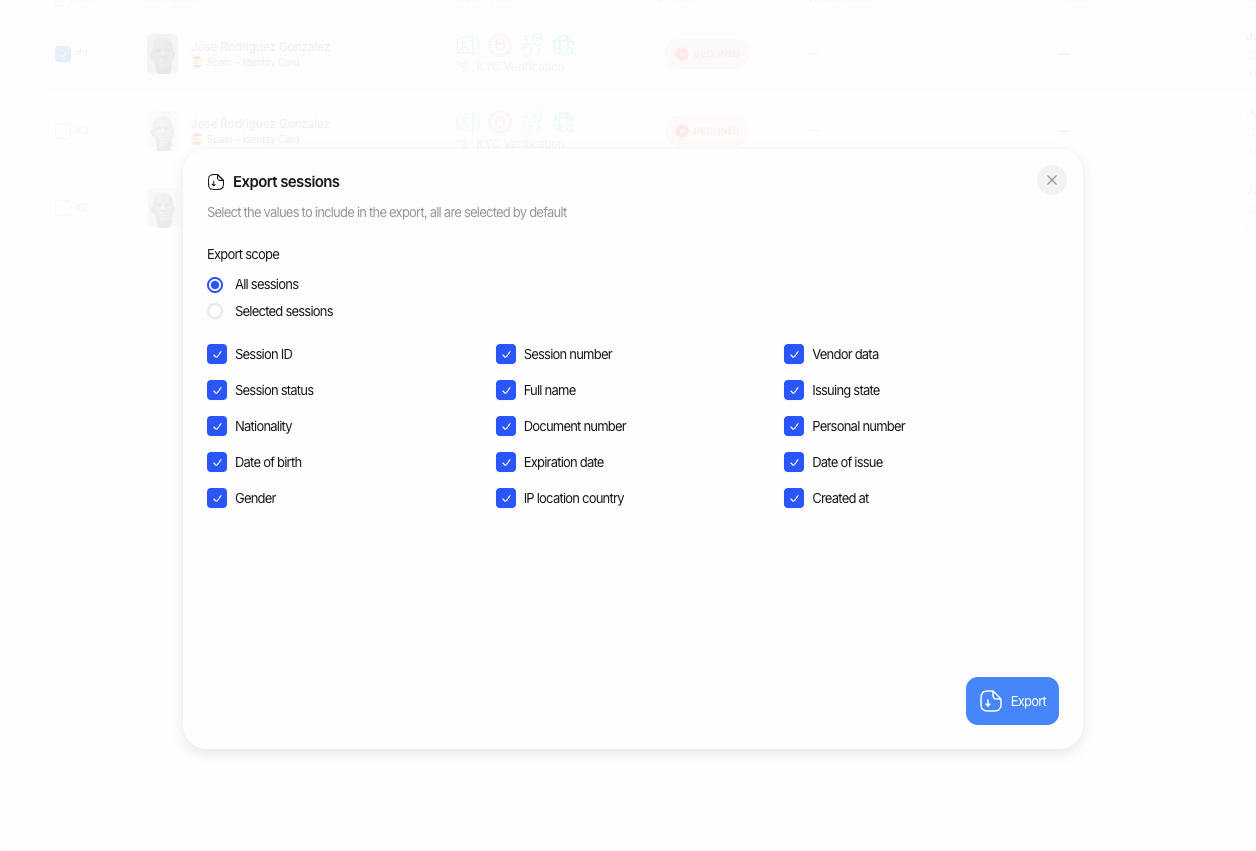 The Export CSV feature allows you to download verification session data in CSV format for further analysis or record-keeping. This powerful tool enables you to customize the exported data by selecting specific columns and filtering sessions based on your needs.