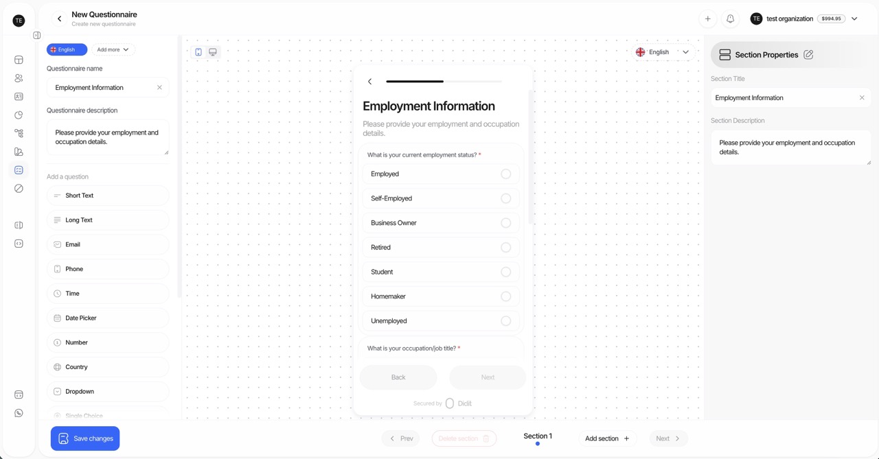 Didit's Questionnaires let you design structured, dynamic forms to collect additional information from users during verification. Use our visual builder to drag and drop elements, organize content into sections, localize text for multiple languages, and route results for manual review when needed.