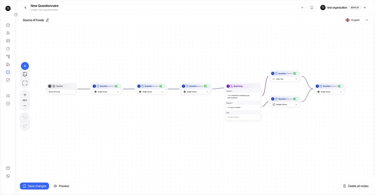 - Workflow Integration: Add questionnaires to KYC or run them standalone as a Questionnaire Verification workflow