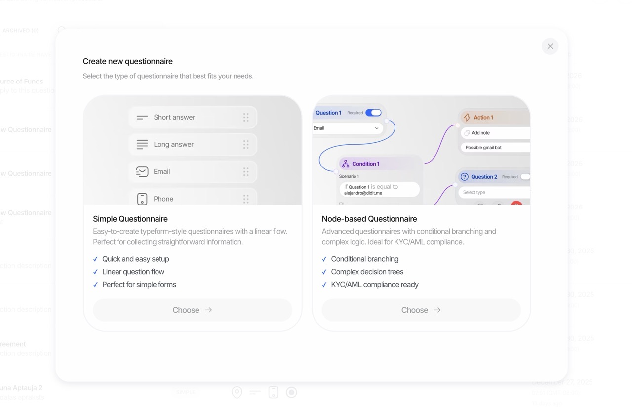 Didit offers two distinct approaches to creating questionnaires, allowing you to choose the right level of complexity for your needs: